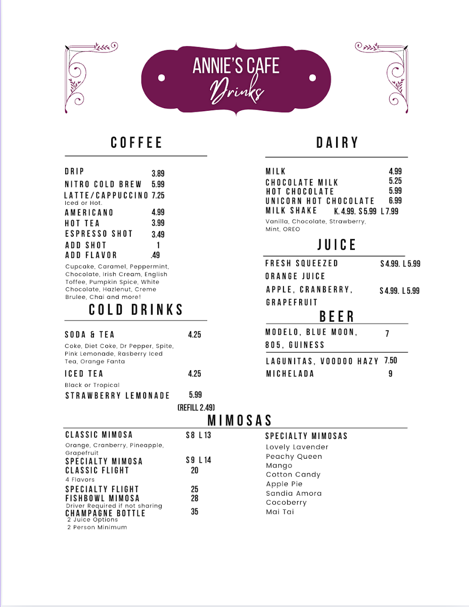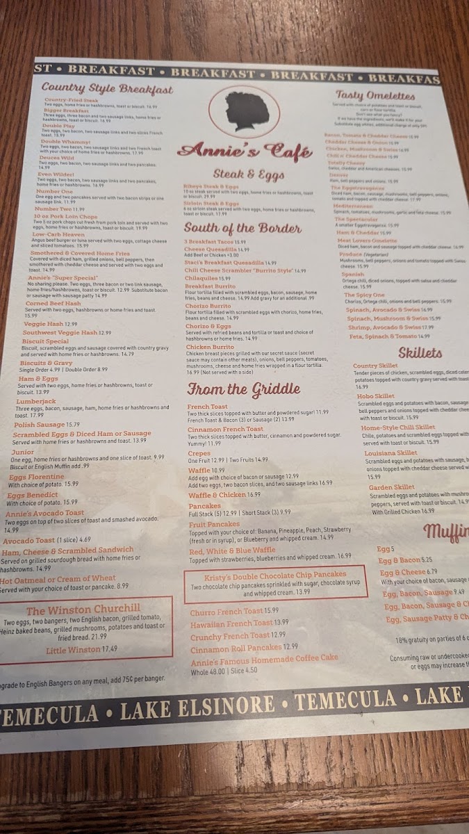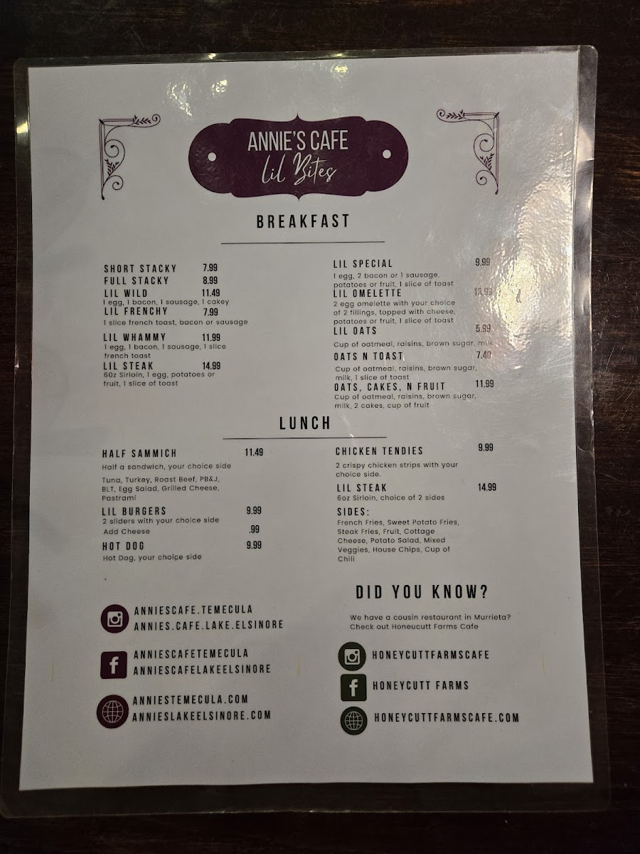 Annie's Cafe Lake Elsinore Menu